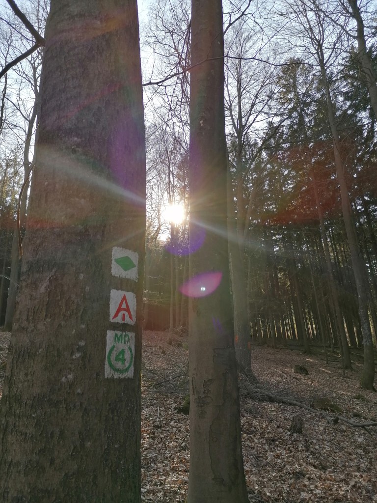 Kurz hinter Michelstadt betreten wir wieder den Wald. Wir lassen uns Zeit, tun es dem älteren Herrn gleich und genießen die Mittagssonne auf einer Bank. Noch immer kneift der Wind. Aber ich habe die erste Nacht überlebt, also wird es in der zweiten auch gehen.