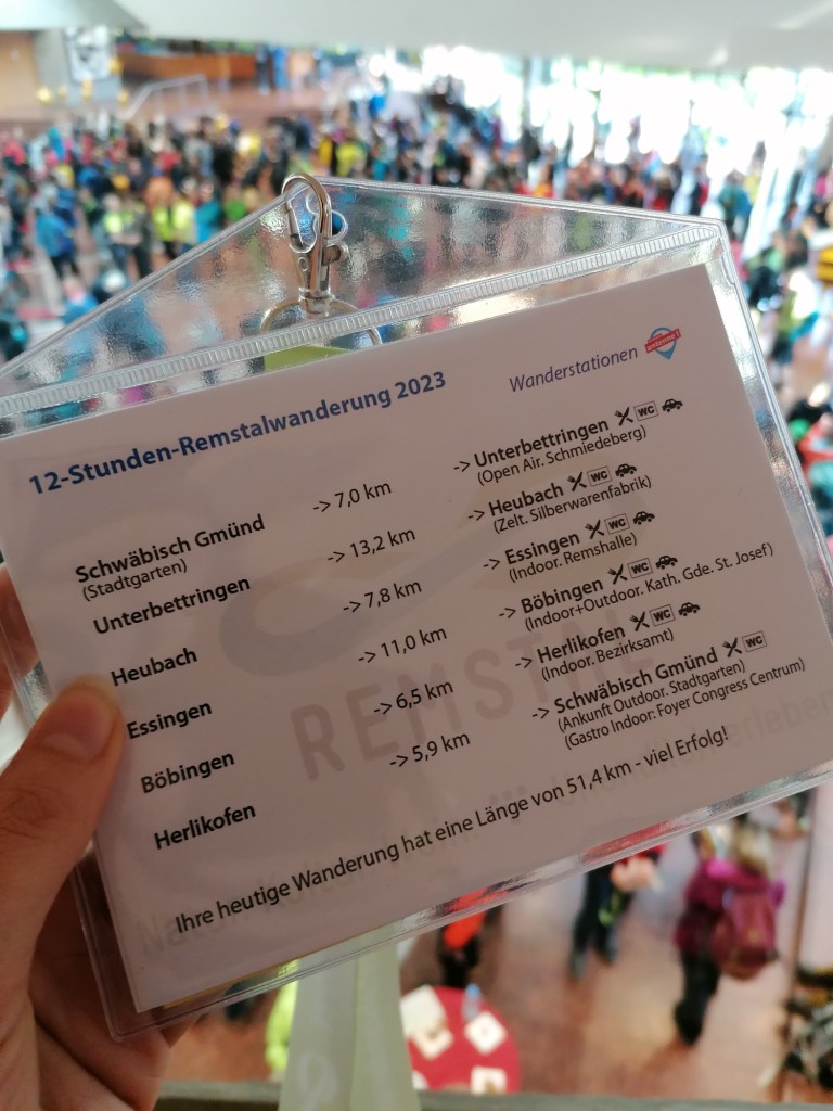 Wir folgen der Konfetti-Truppe Richtung Start. Das Congress-Centrum ist gefüllt wie der Mannheimer Bahnhof zur Rushhour. Überall Rucksäcke, Wanderschuhe, ein paar Stöcke. Die meisten Wanderer rank und schlank, einige tragen Embleme vorangegangener Mega- und Mammutmärsche am Rucksack. Wir holen unsere Startutensilien ab, erhalten eine Karte, eine Streckenübersicht, die man sich um den Hals hängen kann und Verzehrbons im Wert von fünfzehn Euro (für die Teilnahme am Event hatte ich pro Person dreißig Euro bezahlt).